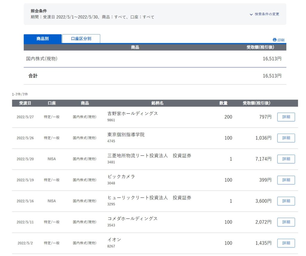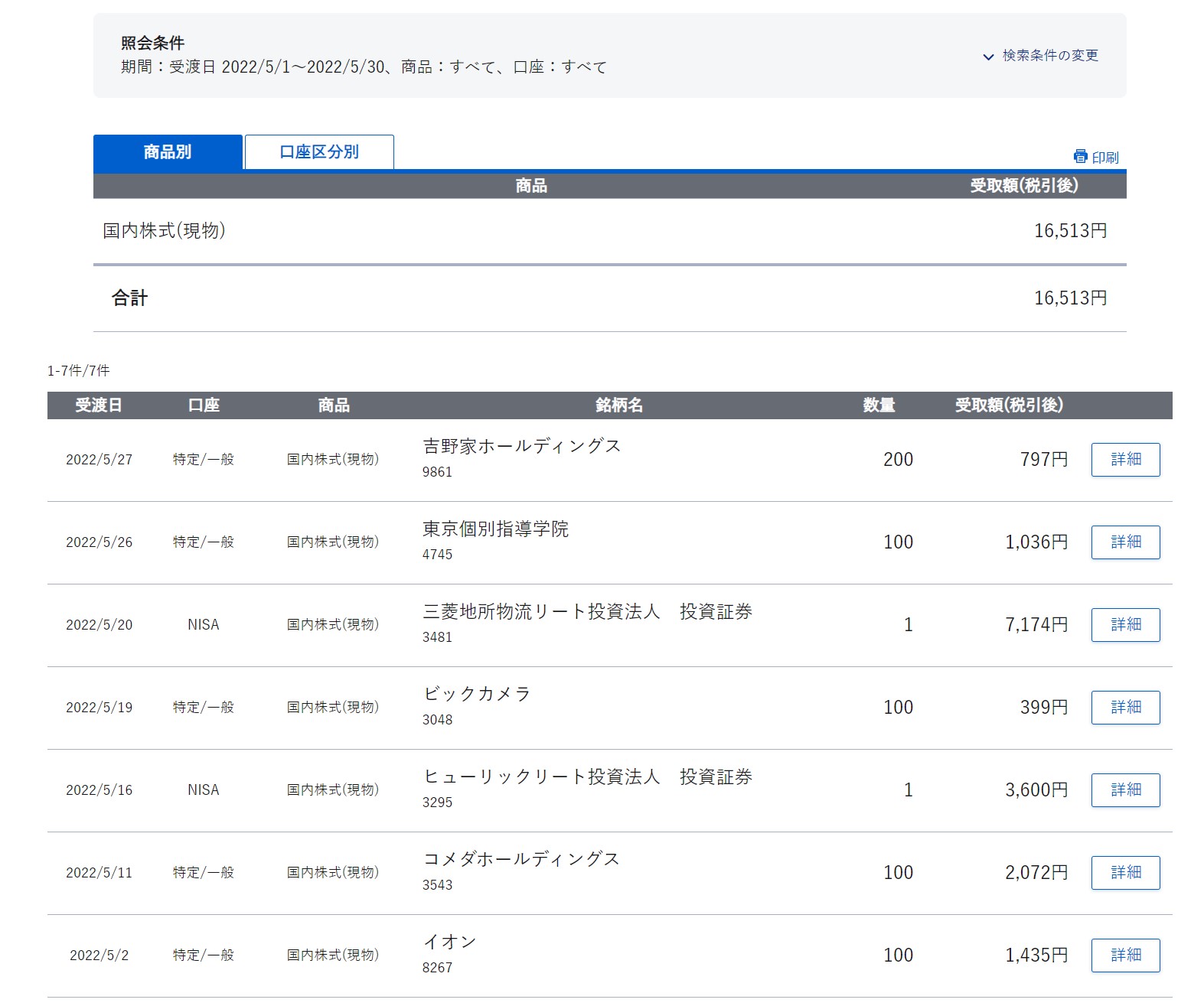 5月は、7件から16513円(税引き後)の配当収入でした。