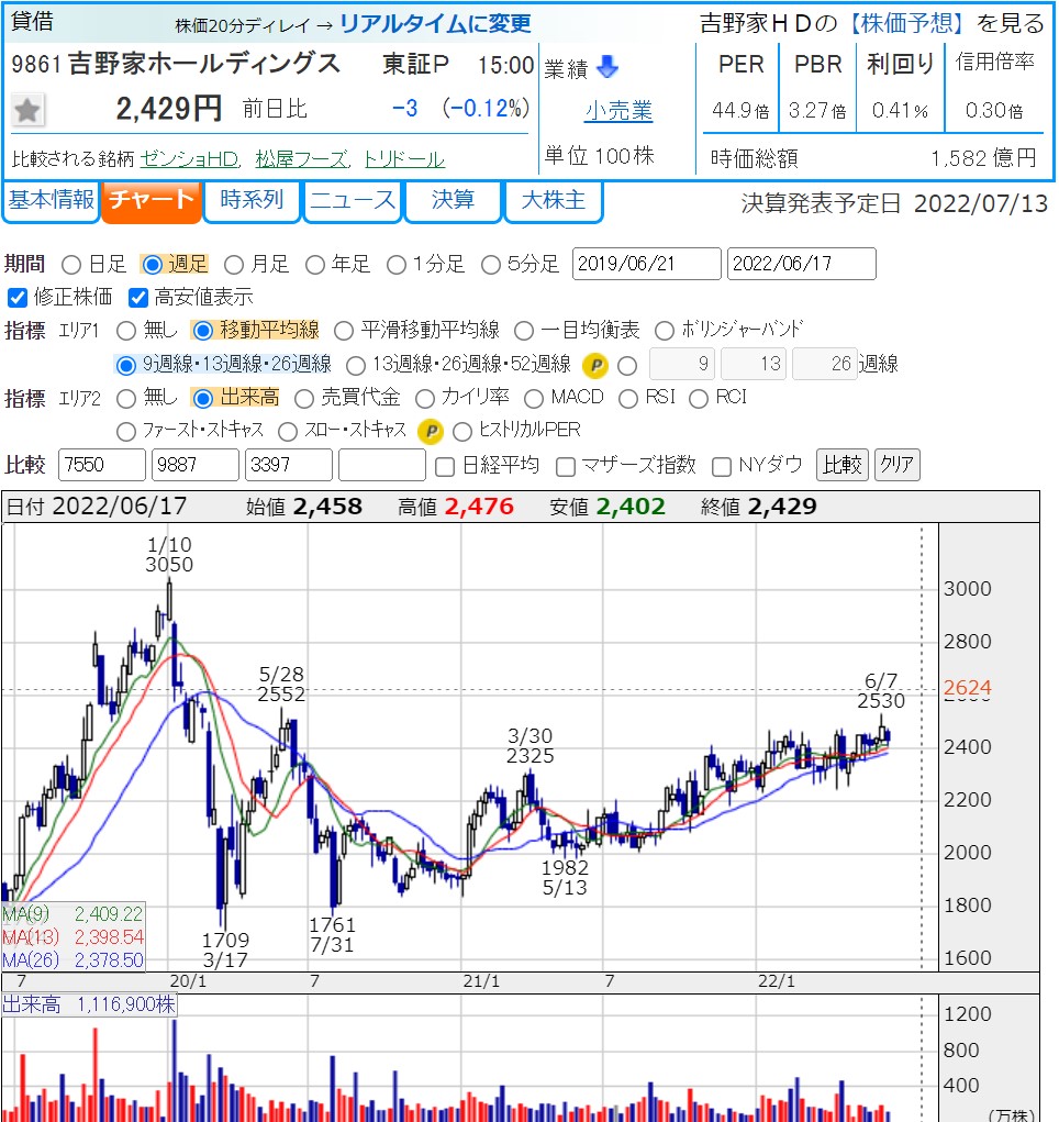 週足は最近ヨコヨコ。いいんじゃないでしょうか。牛丼食えればw