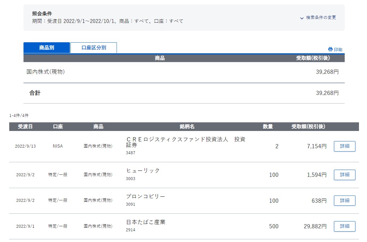 2022年9月の配当収入 39,000円 配当報告 Twitter Facebook はてブ Pocket LINE コピー 2023.01.01 JTの配当金が安心感ある。株価がいつ下がるかが((((;゚Д゚))))ガクガクブルブル 2914 JT3003 ヒューリック3091 ブロンコビリー3487 CREロジ (日本REIT J-REIT)